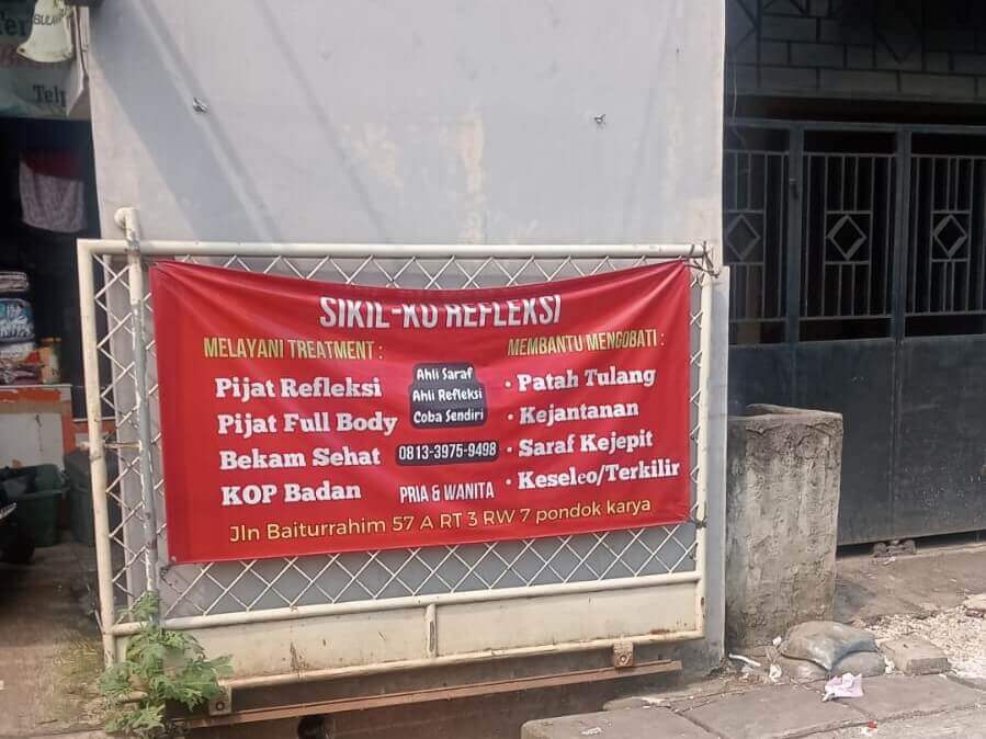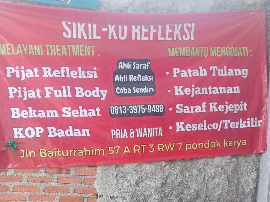 Berlokasi di Jl. Baiturrahim No. 57A, RT 03 RW 07, Pondok Karya, Pondok Aren, Tangerang Selatan, Reflexsi Sikilku telah menjadi rujukan banyak pelanggan tetap yang menginginkan penyembuhan alami, rileksasi otot, hingga penanganan keluhan tertentu seperti masuk angin, sakit kepala, atau masalah kejantanan.